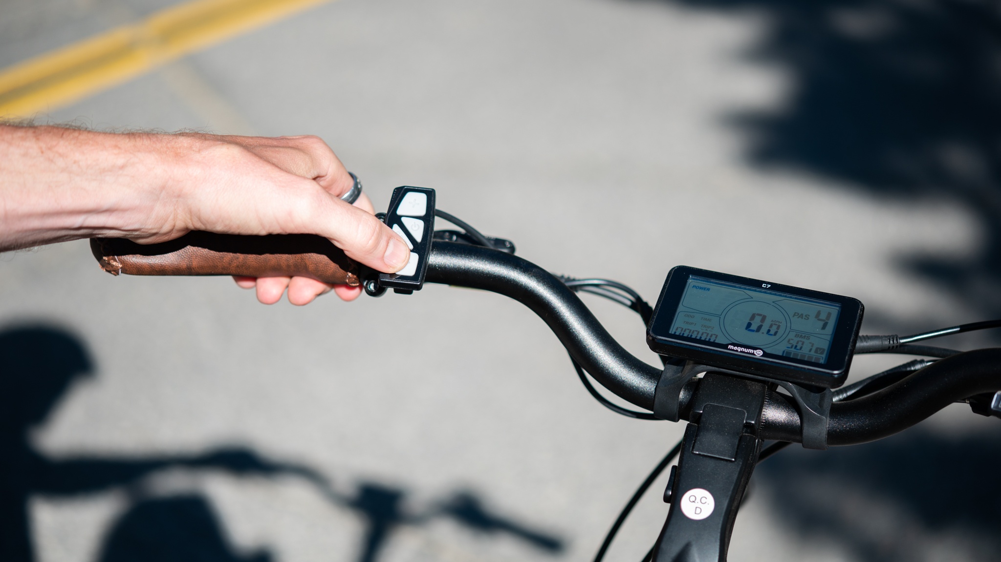 The Metro uses the Das-Kit C7 control and display system, and the controls are mounted on the handlebar next to the left grip. This four buttons on the control box are arranged in an intuitive vertical fashion that isn't hard to reach. The power button performs the obvious function of turning the power on and off once the power at the battery has been turned on first. The + and - buttons are used to increase or decrease the pedal assist level and to scroll through options in the bike's settings. The set button is used to change the data displayed in the lower-left data field on the display, and to select options in the bike's settings. The bikes throttle is located next to the right-hand grip and is activated by a simple press of the thumb.