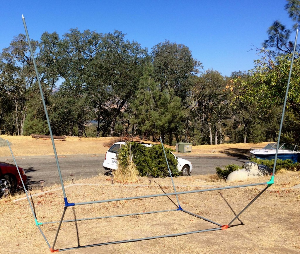 This canopy goes together by building the roof frame upside down first, attaching the corner poles and then flipping it upside down before attaching the polyester material shade part on top.