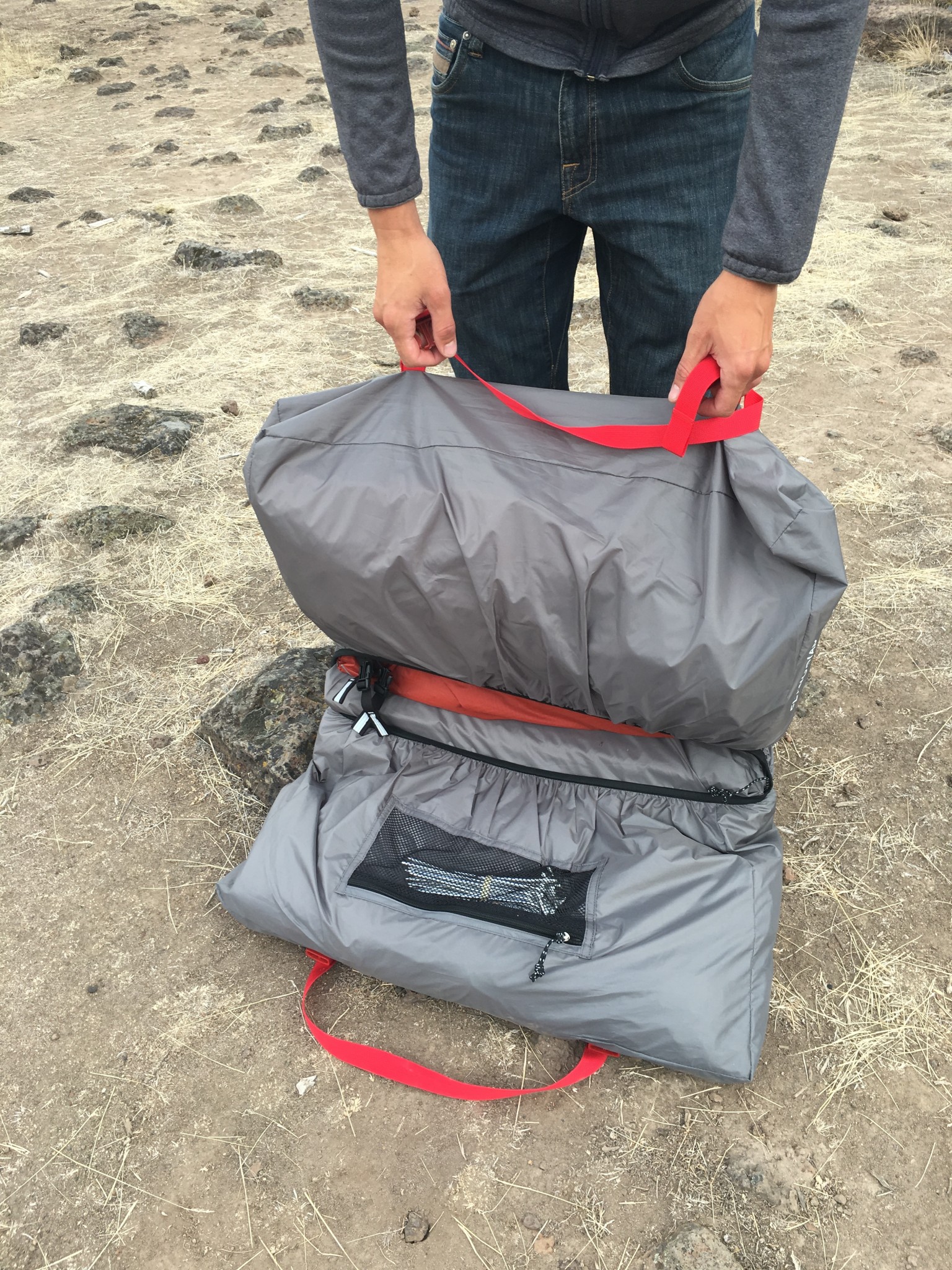 The Flying Diamond has a shoulder strap which is a bit on the short side, but overall it's good carrying system. The bag is organized into three compartments for the fly, tent body, and poles. If you're a folder and not a stuffer, you're rewarded with a less bulky package. That said, the buckle straps allow you to compress some of the loft out of the bag once packed up.