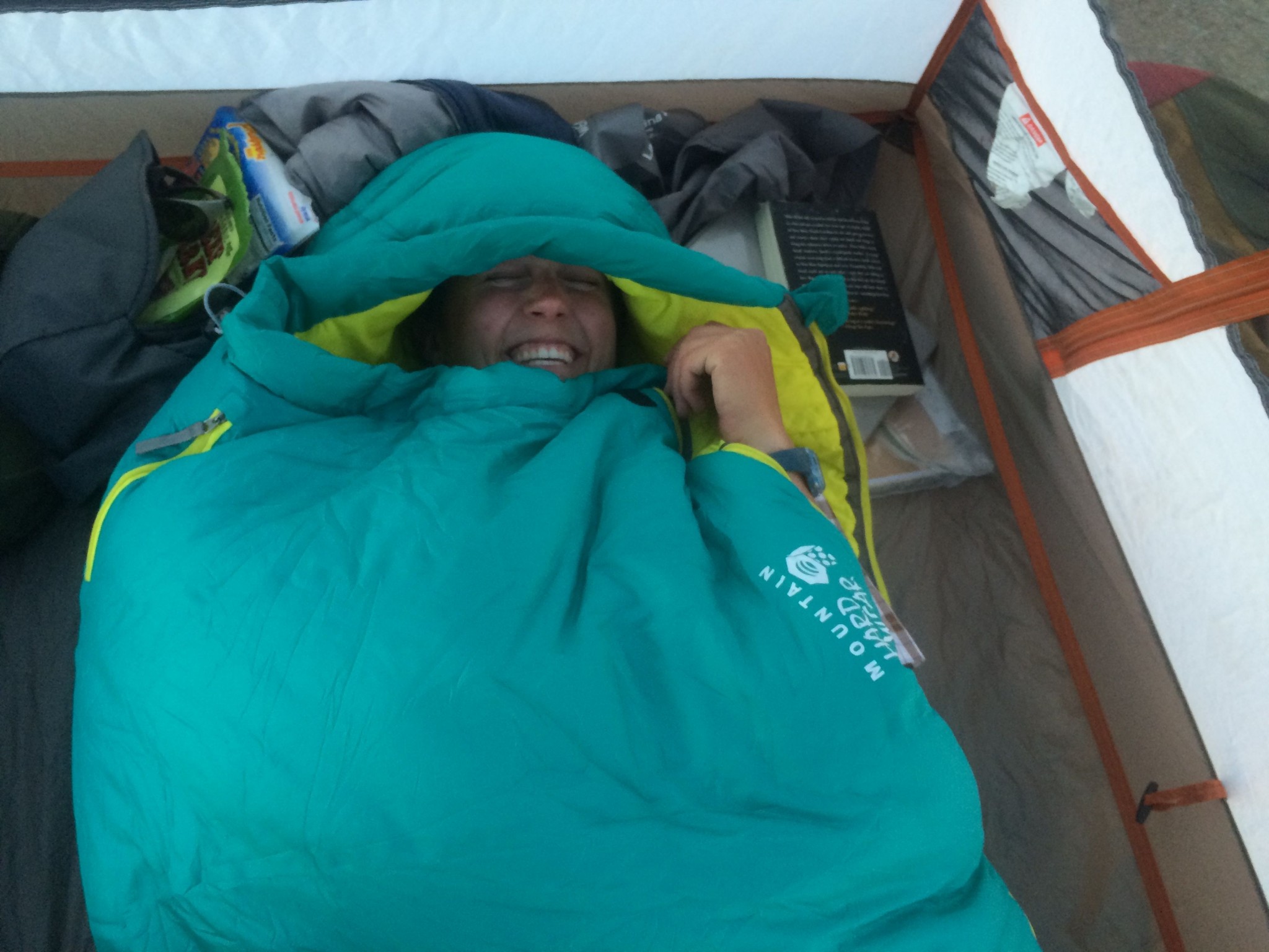 The last synthetic bag we tested from Mountain Hardwear was the super high-quality women's UltraLaminina. When comparing the Laminina Z Flame to its predecessor, it is a step-down, and we noticed it was not as lofty or warm. That being said, it keeps us warm on summer nights in the alpine and seems to keep drafts out with its draft collar and warm hood. Mountain Hardwear has added extra insulation to the foot box of this bag, so our extremities stay toasty warm. The bag's draft collar seems to be in a strange place, much lower than where our necks are, sitting around our tester's shoulders — making it ineffective to keep drafts out from around our neck unless we scooted way down in the bag (but then our faces are covered up).