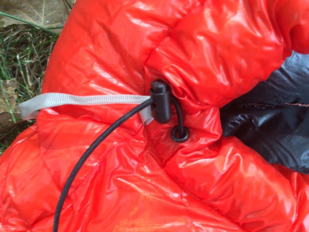 This mummy bag uses a 32" #3 zipper that is backed by a small draft tube. As we've noted, the poor function of this zipper is this model's main drawback. The hood closure of this bag stands out as very functional and comfortable. Independent cinch cords for the brow and lower part of the opening allow fine tuning and the down-filled baffles here are warm and comfortable.