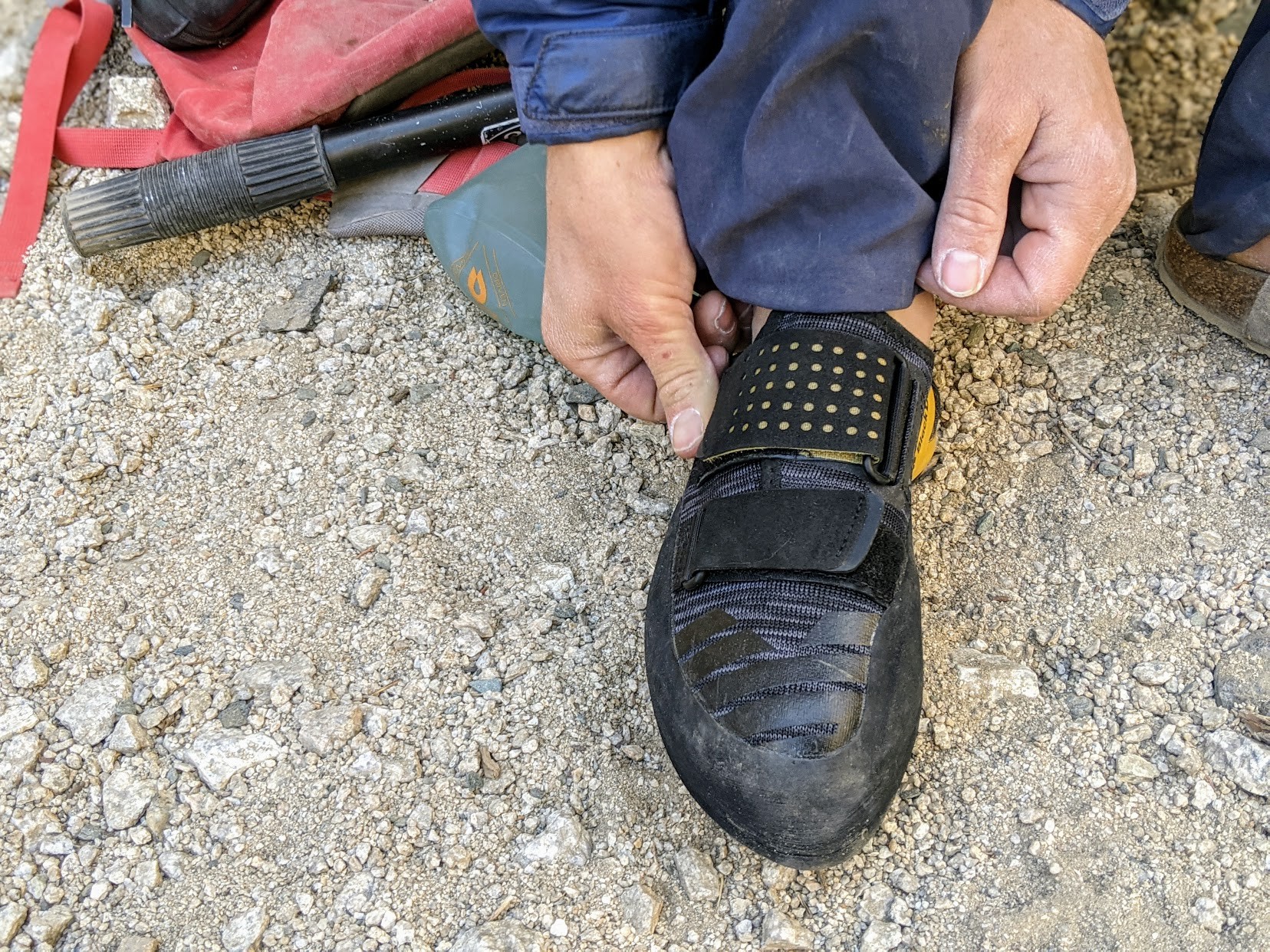 Though it is seemingly designed for easy use — two Velcro straps and a tongue that opens on the top, the Black Diamond Zone gets a lower score here because of all the fit issues. Our biggest concern with this shoe is the challenge with fit and sizing, which is a major issue in buying climbing shoes, especially when ordering online. We had a hard time getting this shoe on and off, even with the proper sizing.