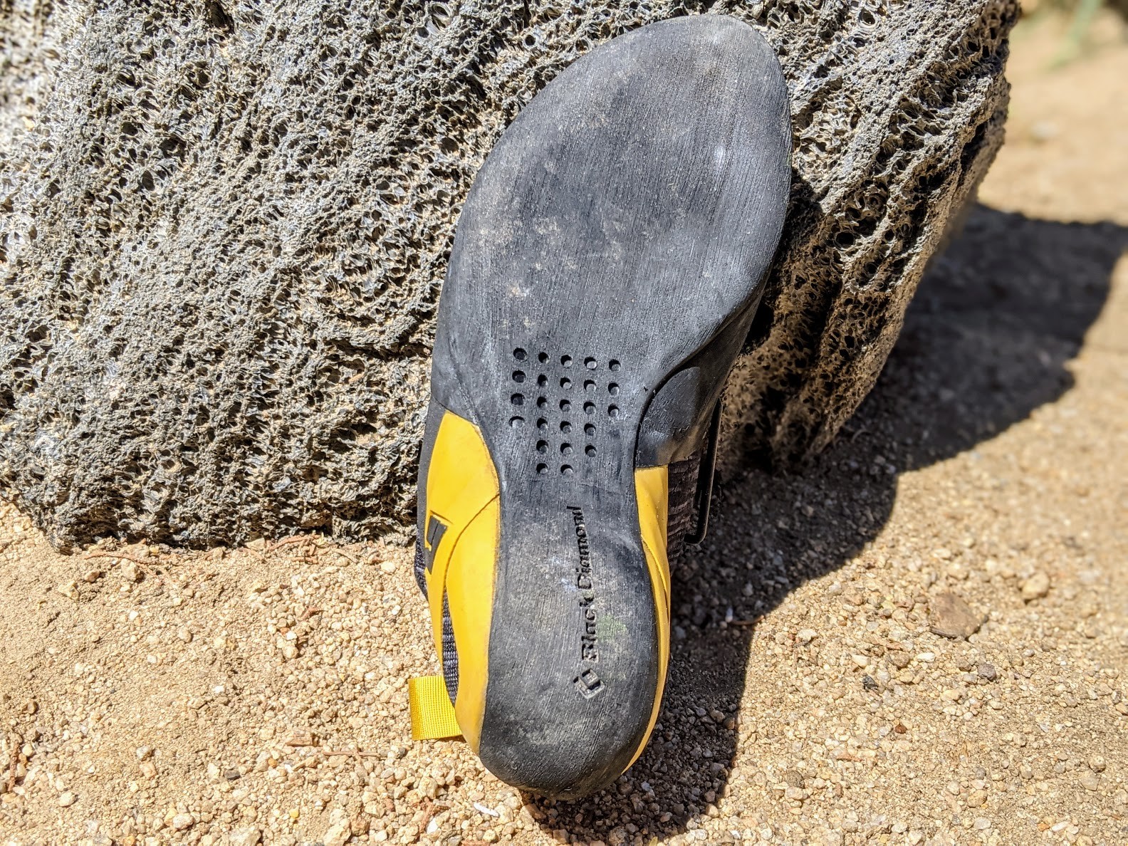 The aggressive shape and seriously stiff midsole on the Black Diamond Zone make for a shoe that lacks sensitivity. The 4.3 mm Fuse rubber sole feels thick compared to other models with only 4 mm of rubber on the toe. This is a positive in terms of longevity — more rubber to wear through before your next resole — but it also means that the shoe will lack sensitivity for a while until that 4.3 mm is worn in a bit. We were hesitant to stand on tiny smears in this shoe because of the stiffness of the sole and the lack of sensitivity in the toe box.
