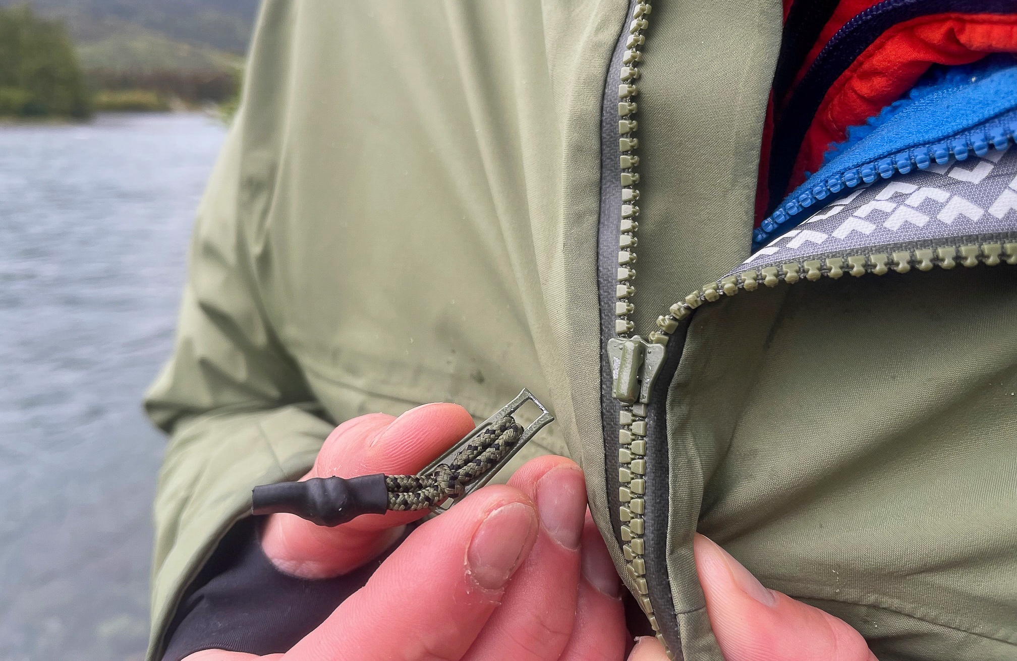 Although our testers enjoyed many of this jacket's features, they were concerned about the design of a few others. When the waist cord is tightened it leaves a long loop of slack which is prone to snagging on tree branches or carabiners. We were also upset to observe a failure of the main zipper slide. The metal pull tab on the main zipper broke off for no apparent reason, which is a frustrating thing to see on a premium piece of clothing.