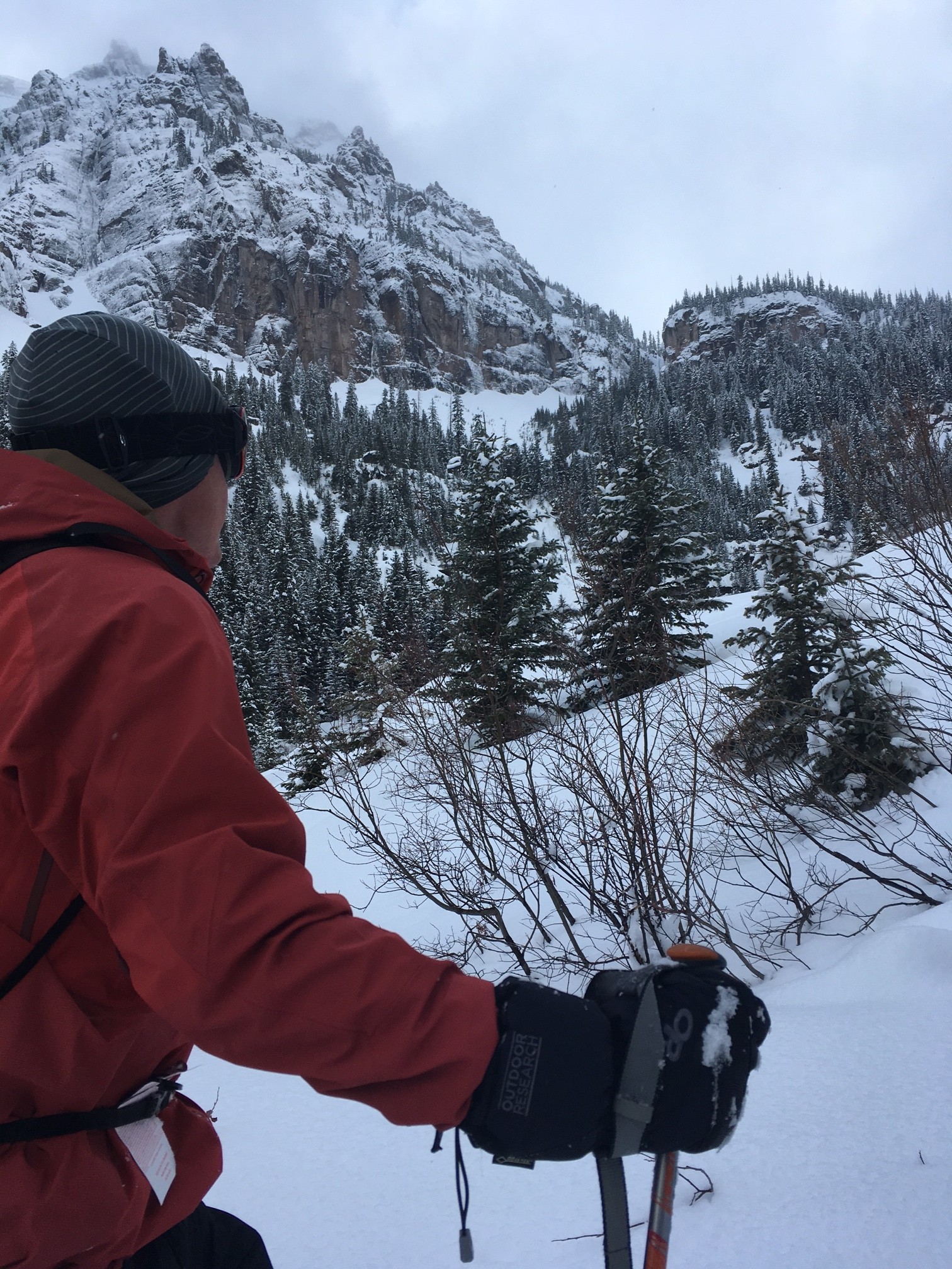 Enjoying the awesome scenery of the San Juans on a side-country lap outside of Telluride ski area while wearing our Top Pick for Resort Skiing.