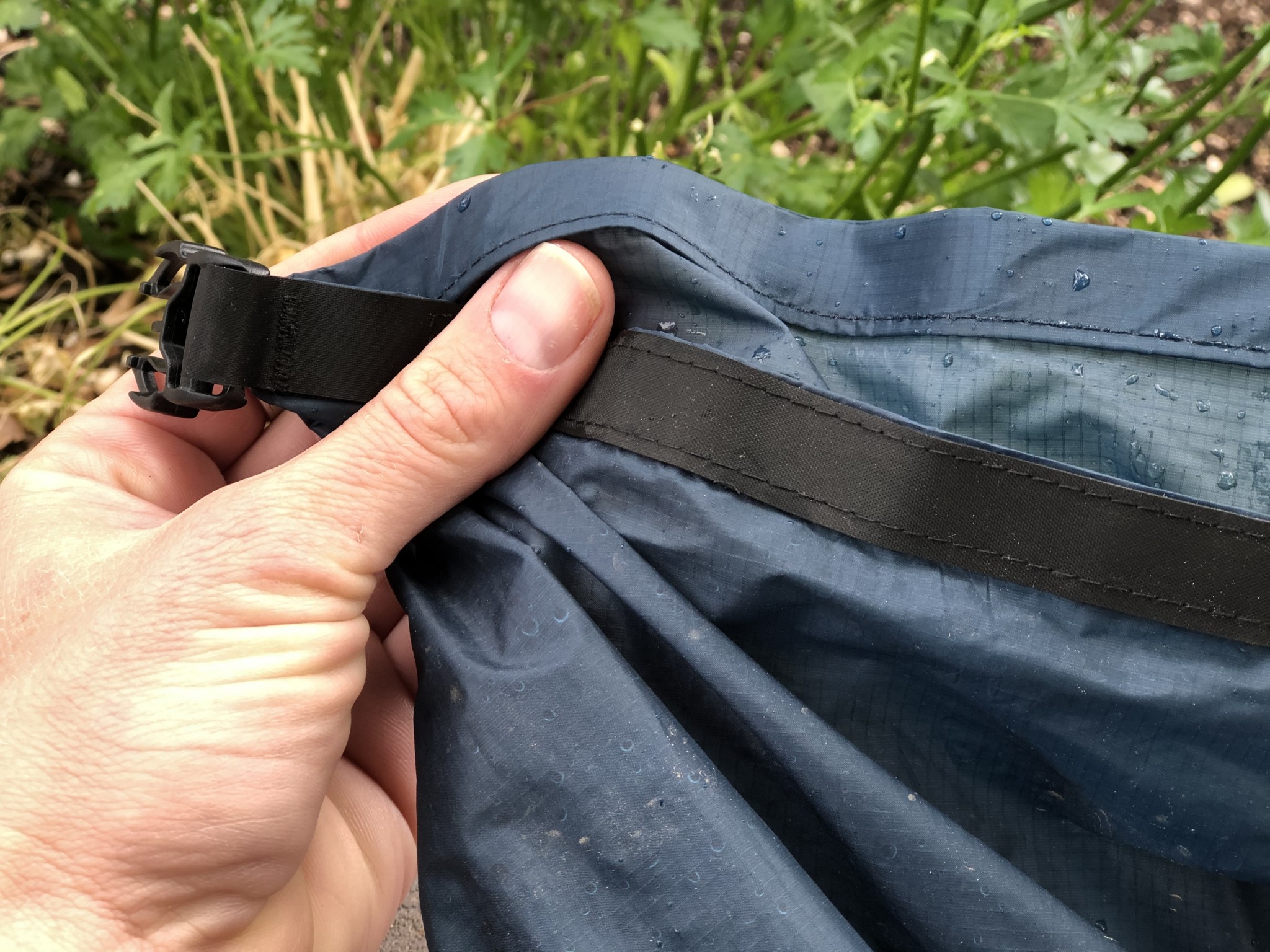 Despite being one of the thinnest bags we tested, the material of the Droplet XL is quite waterproof. It easily kept pressurized hose water at bay and didn't soak up any water even after prolonged submersion.