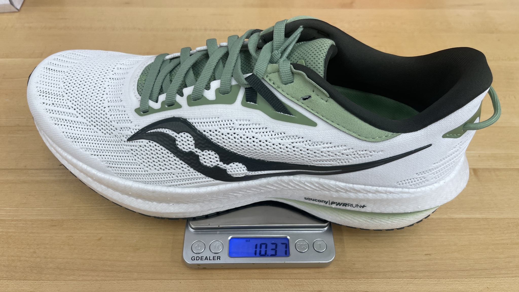 The Triumph boasts a thick stack of foam and a comfortable upper, great attributes for a daily trainer. None of that suggests this should be a lightweight shoe — and it isn't. We weighed it at 10.37 ounces per shoe and definitely noticed the weight at faster paces.
