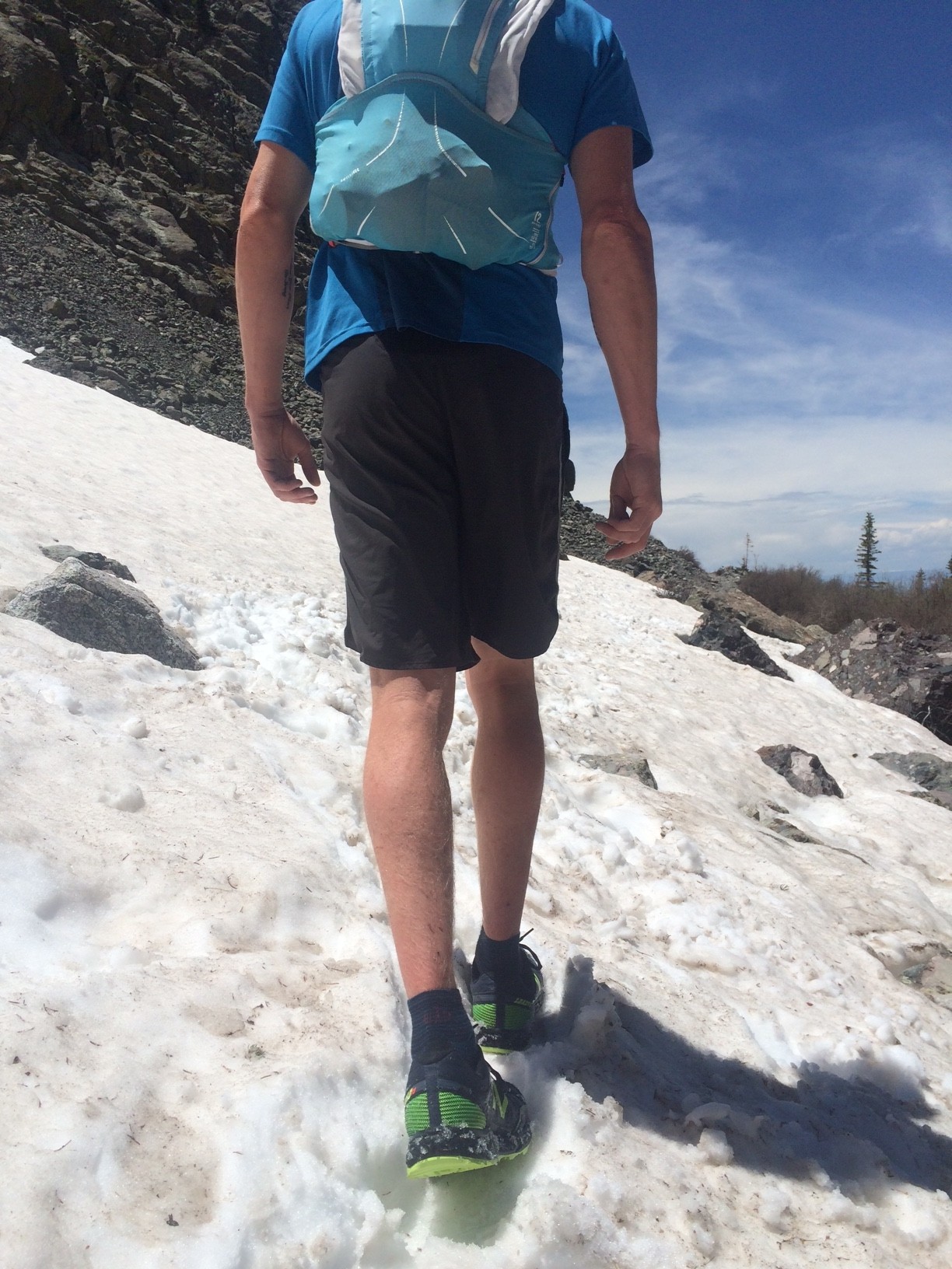 The lug pattern consists of a row of triangularly shaped lugs in the middle and directional incut lugs around the edges. We found that the rubber offered a good balance of stickiness and durability. It did a decent job of shedding mud well, and also gave us enough traction for navigating late spring snow fields in the mountains. While we found it to be just as sticky in the grass and on dry dirt as the aggressively lugged Saucony Peregrine 7, they performed comparatively poorly on wet rock.