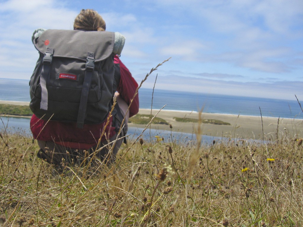 The Timbuk2 Swig on a day hike along the Point Reyes National Seashore. Note how the flap and straps can hold larger items that don't fit in the main compartmnent. Credit: Kirsten Lindquist